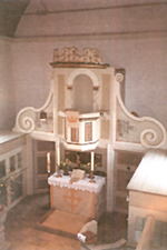 Der rechteckige Kirchenraum wird von einer tonnenförmigen, parabolischen Holzdecke überwölbt, die eine lichte Höhe des Raumes von ca. 8.45 m gewährt. Unter die alte Holzverschalung von 1747/48 wurde 1956/57 eine 15 mm starke, gespundete und gestäbte Deckenschalung aus Fichtenholz genagelt. An der Ostseite des Kirchenraumes steht der Altar aus Natursteinen, der eingefügt ist in ein Altarretabel mit der Kanzel über dem Altar. Priechen für den Pastor und den Patron flankieren das Retabel. Diese Einrichtung stammt aus dem Mitte des 18.Jahrhunderts, während die beiden weiteren Priechen für den Kirchenvorstand einige Jahrzehnte später (Ende 18. Jh.) angefügt wurden. Zur Erstausstattung der Kirche gehören auch die Holzbänke des Kirchenschiffs. |
