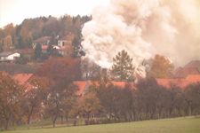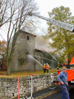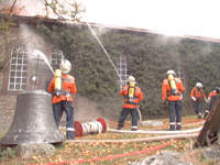 "Die Kirche brennt" In den stillen Sonntagmorgen hinein hatte die Sirene gegen 8.15 Uhr Feuer-Alarm verkündet. Die Ortsfeuerwehr Roringen war mit ihren beiden Löschfahrzeugen bereits kurz vor 8.30 Uhr an der Kirche. Wenige Augenblicke später trafen die Löschfahrzeuge der Göttinger Berufsfeuerwehr ein. Dunkler Qualm drang aus den Schallöchern des Turms und an der Verbindungsstelle von Turm und Dach des Schiffes. Er nahm zu und hüllte schließlich Turmhelm und Kirchendach ein. Der leichte Wind trieb ihn nach Nordosten gegen den Menzelberg. Flammen waren nicht zu sehen. |
